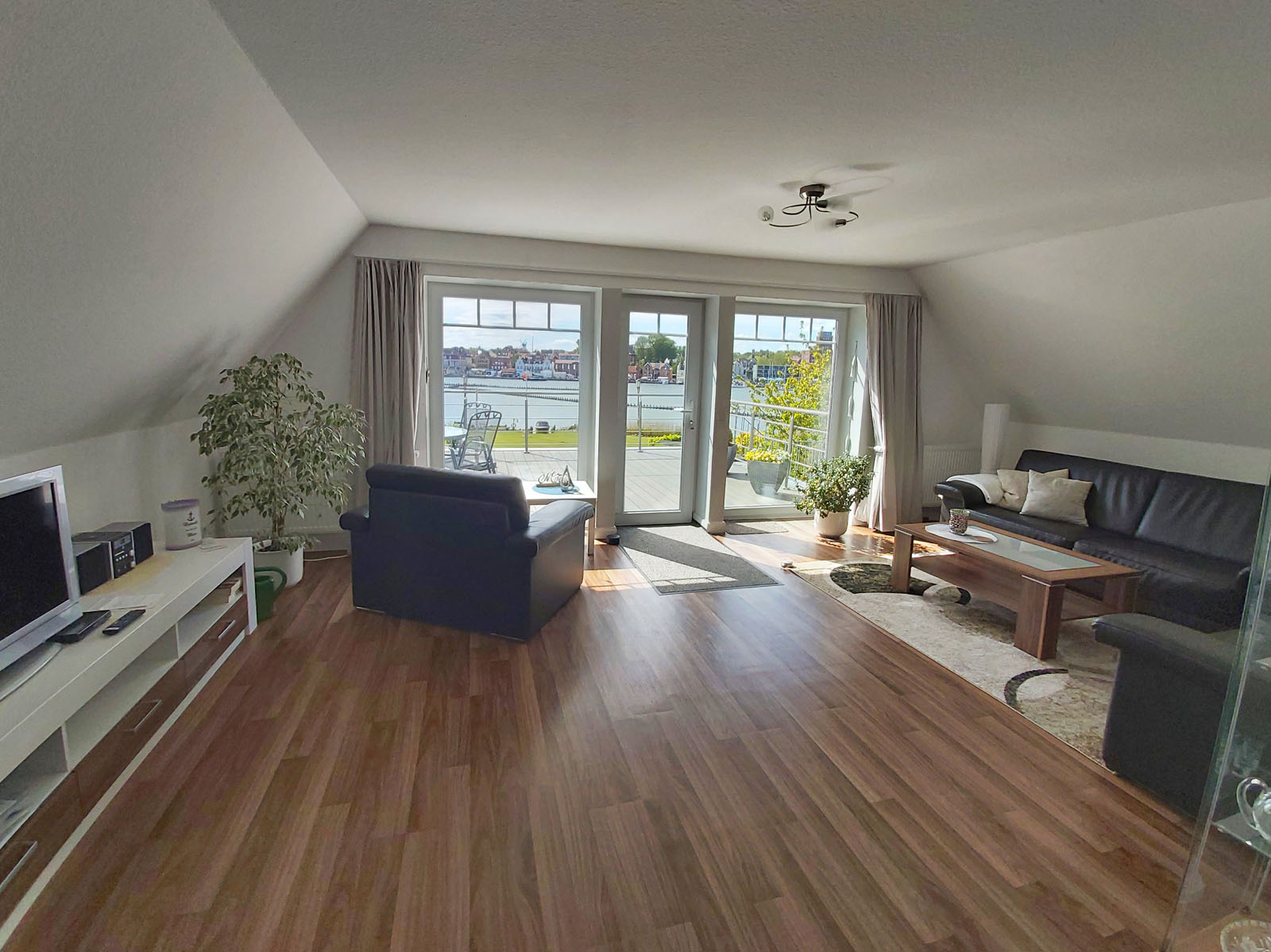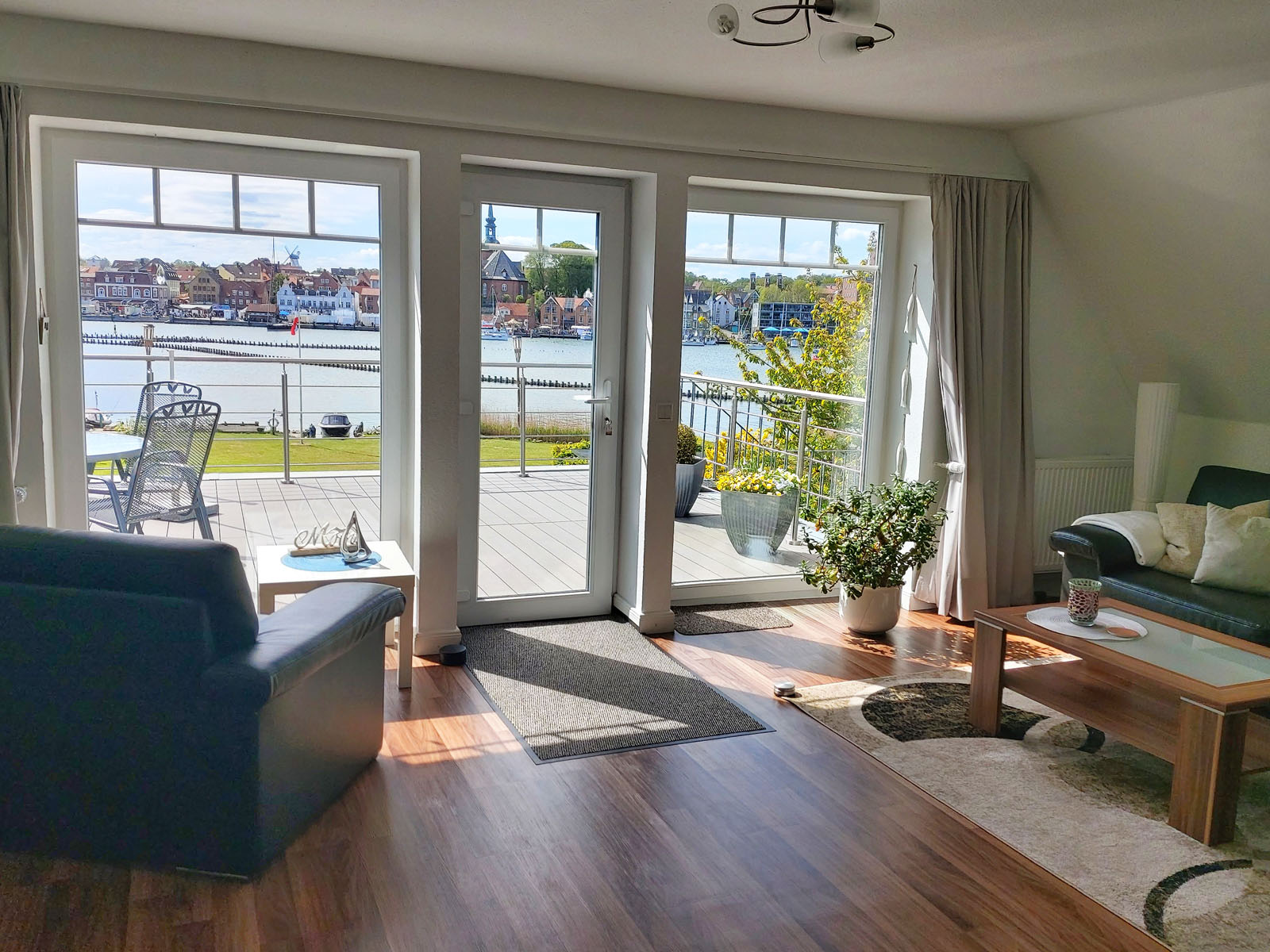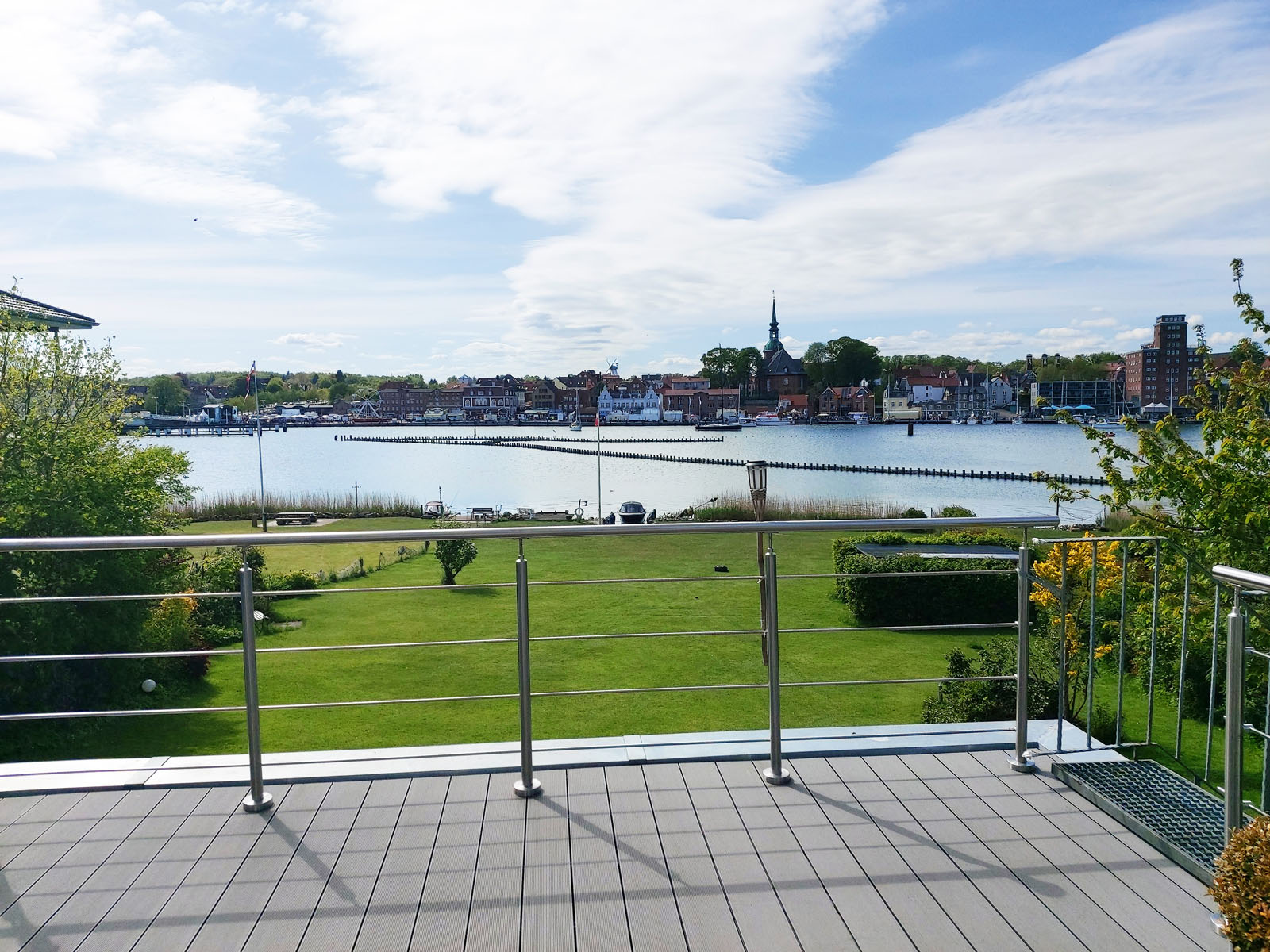 Schöne Ferienwohnung mit 4 Bettenplätzen im Obergeschoss Schiffergang 1 in 24376 Kappeln an der Schlei und nahe der Ostsee. Das große Grundstück ist direkt am Schleiufer und besitzt einen Steg. Aus dem Haus haben Sie einen direkten Blick auf die Schlei und die Kappelner Skyline. Genießen Sie aus dem Wohnzimmer oder von der großen Terrasse den einmaligen Blick über die Schlei (Ostseefjord) auf den letzten Heringszaun Europas und auf den Hafen und die Altstadt von Kappeln (Deekelsen). Vom Ufer neben unserem Ferienhaus wurden auch Aufnahmen für die ZDF Serie: "Der Landarzt" aufgenommen. Die Kleinstadt Kappeln mit ca. 10.000 Einwohnern ist im Film der fiktive Ort "Deekelsen" an der Schlei. Die Raumaufteilung ist wie folgt: Großer Wohnraum mit separatem Essplatz, Küche mit neuer Einbauküche, 3 Schlafräume mit je 2 Betten, 2 Duschbäder mit WC. (bei Buchung von 2 Personen wird nur 1 Duschbad gestellt, alternativ 2 Duschbäder gegen höhere Reinigungspauschale.) Eine schöne Terrasse und ein großer Garten stehen Ihnen ebenso wie ein PKW Stellplatz zur Verfügung. Weitere Stellplätze befinden sich in ausreichender Zahl nur ca. 50m entfernt. Das Ufergrundstück ist 2700 m² groß und bietet genug Platz zum Sonnenbaden, relaxen oder spielen. Der Schiffergang ist eine ruhige Anlieger-Sackgasse. Zum Schleiufer sind es nur wenige Schritte. Hier befindet sich Ihr privater kleiner Holzsteg mit Sitzgelegenheit. Von dort haben Sie einen der schönsten Ausblicke auf den Heringszaun, die Schleibrücke, den Hafen mit Ausflugsschiffen, Gastliegerhafen und auf die Altstadt von Kappeln – genießen Sie es! Natürlich können Sie auch von der Terrasse oder aus dem Wohnzimmer die Schlei und den neuen Heringszaun bewundern. Mit den schönen Eindrücken krönen Sie den Tag bei einem traumhaften Sonnenuntergang über Kappeln und der Schlei von der Terrasse oder aus dem Garten Ihres Ferienhauses. Sie können von unserem Ferienhaus zu Fuß, mit dem Rad oder dem Auto, Kappeln und die Landschaftsteile Angeln und Schwansen und die nahe Ostsee erkunden. In der Nähe gibt es viele weitere Sehenswürdigkeiten wie das Landesmuseum Schloß Gottorf und das Wikingermuseum Haitabu in Schleswig, das Wasserschloß Glücksburg, Multi Mar Wattforum (Wale, Watt, Weltmeere) in Tönning, die Phänomenta (eine interaktive Ausstellung) in Flensburg, eine Museumsbahn fährt zwischen Kappeln und Süderbrarup, Fischmarkt in Kappeln und Eckernförde, Schleifahrten mit einem Raddampfer, Tolkschau Freizeitpark, Damp Wellnesscenter mit Entdeckerbad für die Kleinen und vieles mehr. Weitere Sehenswürdigkeiten in Kappeln Sehenswürdigkeiten in der Schlei Region